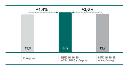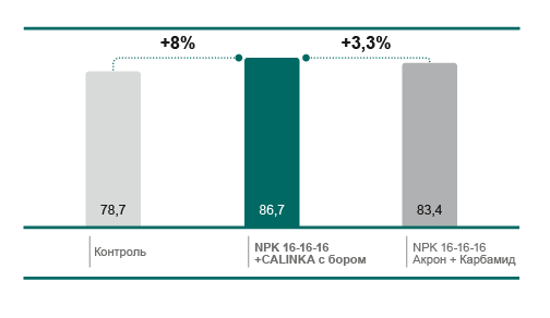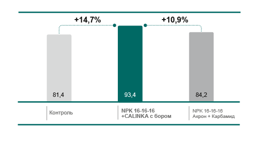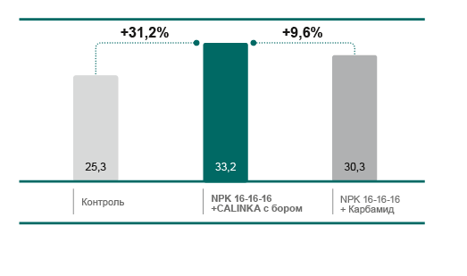| Контроль | NPK Акрон 16-16-16 (200 кг/га) + Нитрат кальция CALINKA марка А Премиум (300 кг/га) | NPK Акрон 16-16-16 (500 кг/га) + Нитрат кальция CALINKA марка А Премиум (200 кг/га) | В предпосевную культивацию + подкормка в гребневание |